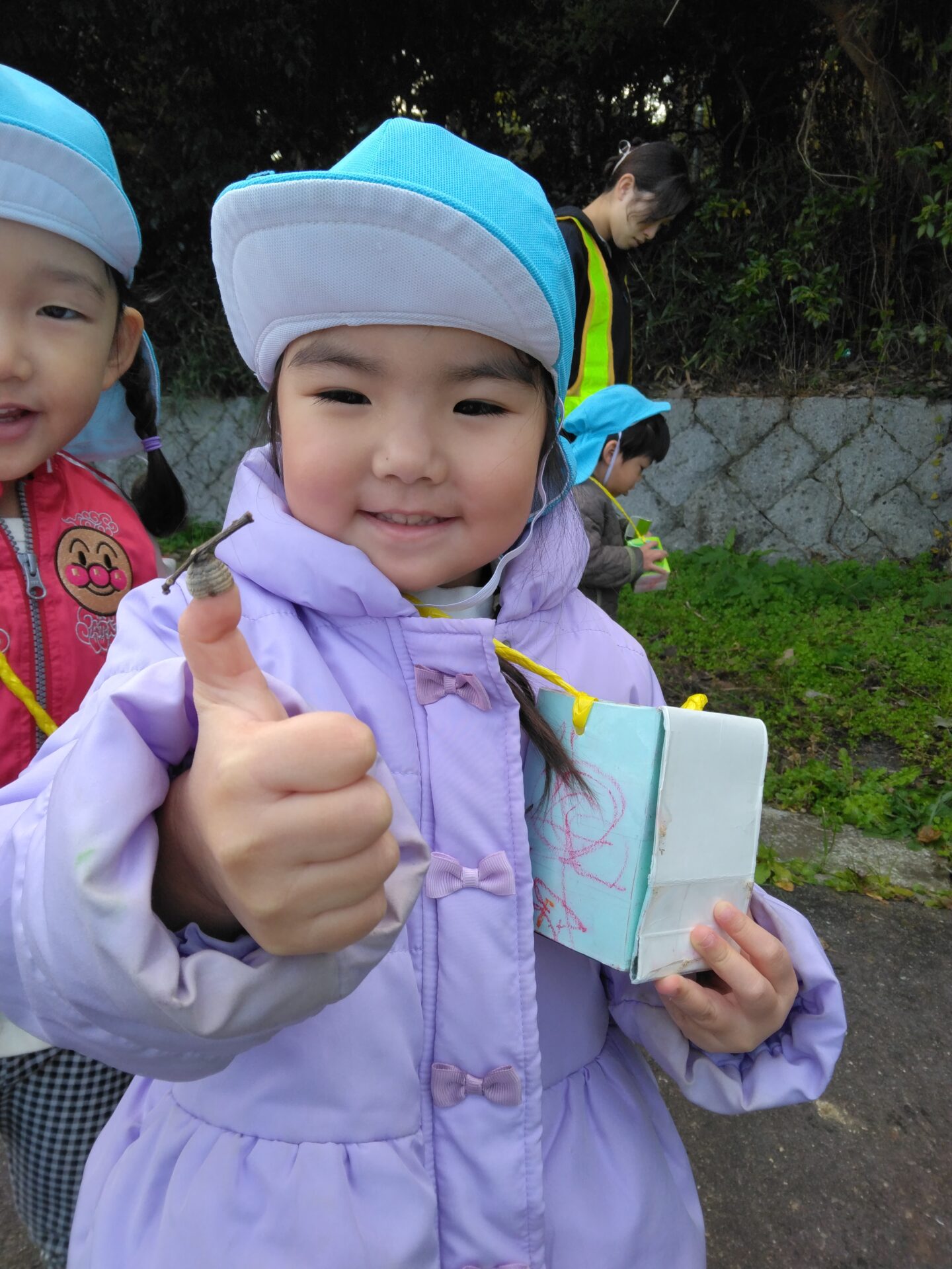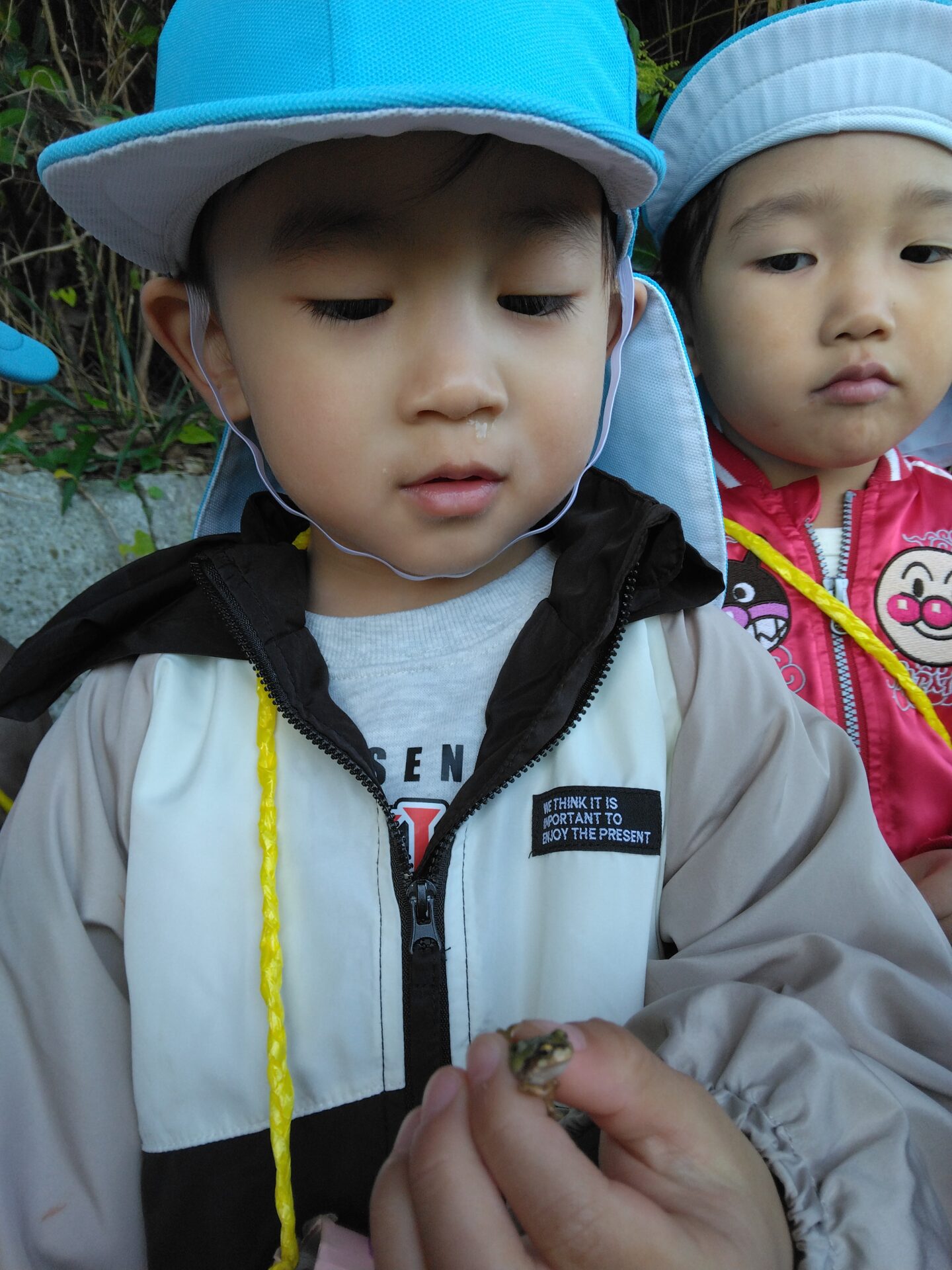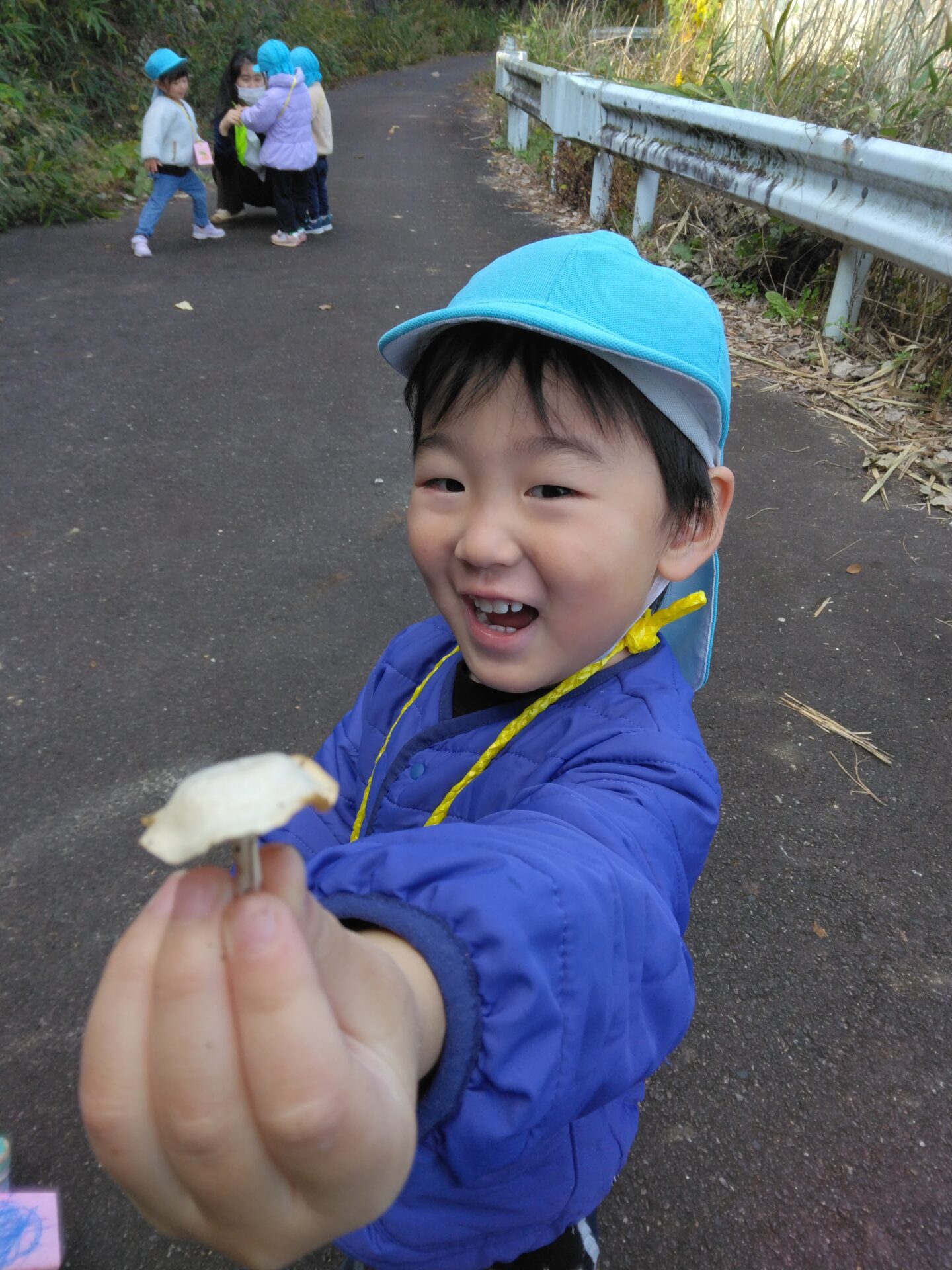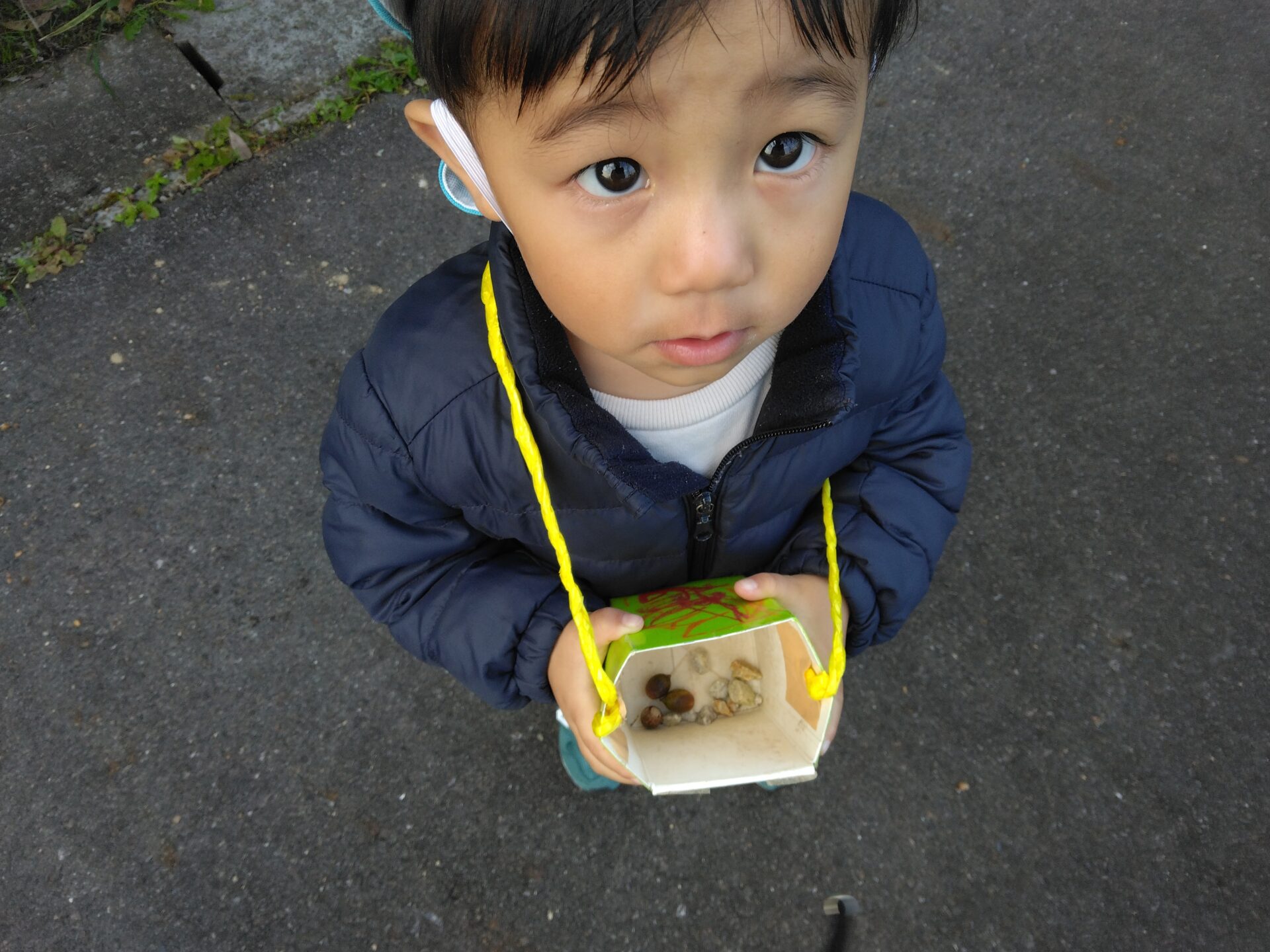 未就園児事業「すこやかくじら」の友だちと一緒に、ひのきが丘公園の近くまで散歩に出かけました。どんぐりの歌をうたいながら、木々の間を通って歩いていくと、どんぐり、栗、紅葉した葉っぱなどを見つけ、喜んでいました。ダンゴムシやコオロギ、カエルもいて、捕まえようと頑張っている姿もありました。風が冷たくなってきましたが、できるだけ散歩に出かけ、季節を感じる身近な自然物に触れていきたいと思います。