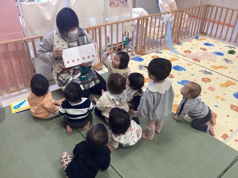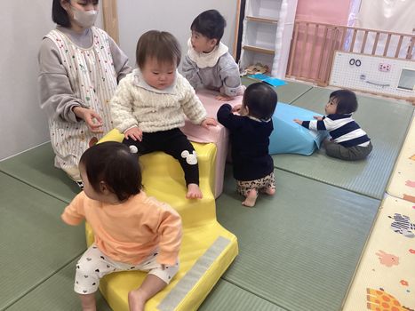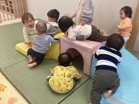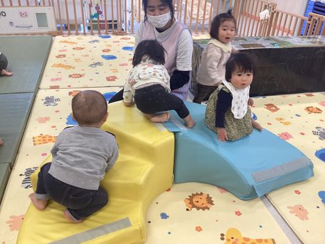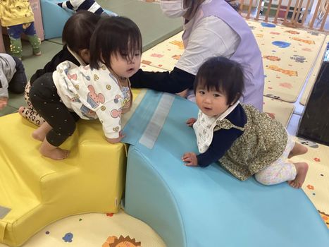 2025.11.30 お知らせ 0歳児 うみチーム 「室内では…」 サーキット遊びをしてから絵本を見て過ごしました。サーキット遊びでは階段を登って滑り、トンネルをくぐって、たくさん身体を動かしました。その後は皆んな大好き“だるまさん”の絵本を見ました。少しずつ内容も覚えたようで、「目!」や「毛!」と答える姿も!絵本の言葉を通して、新しい言葉や音に触れ言葉の発達に繋げていければと思います。 一覧へ戻る