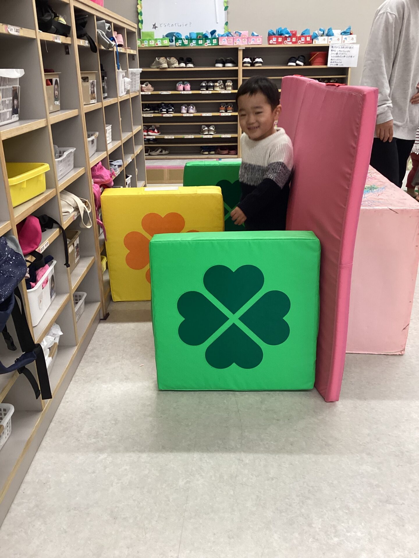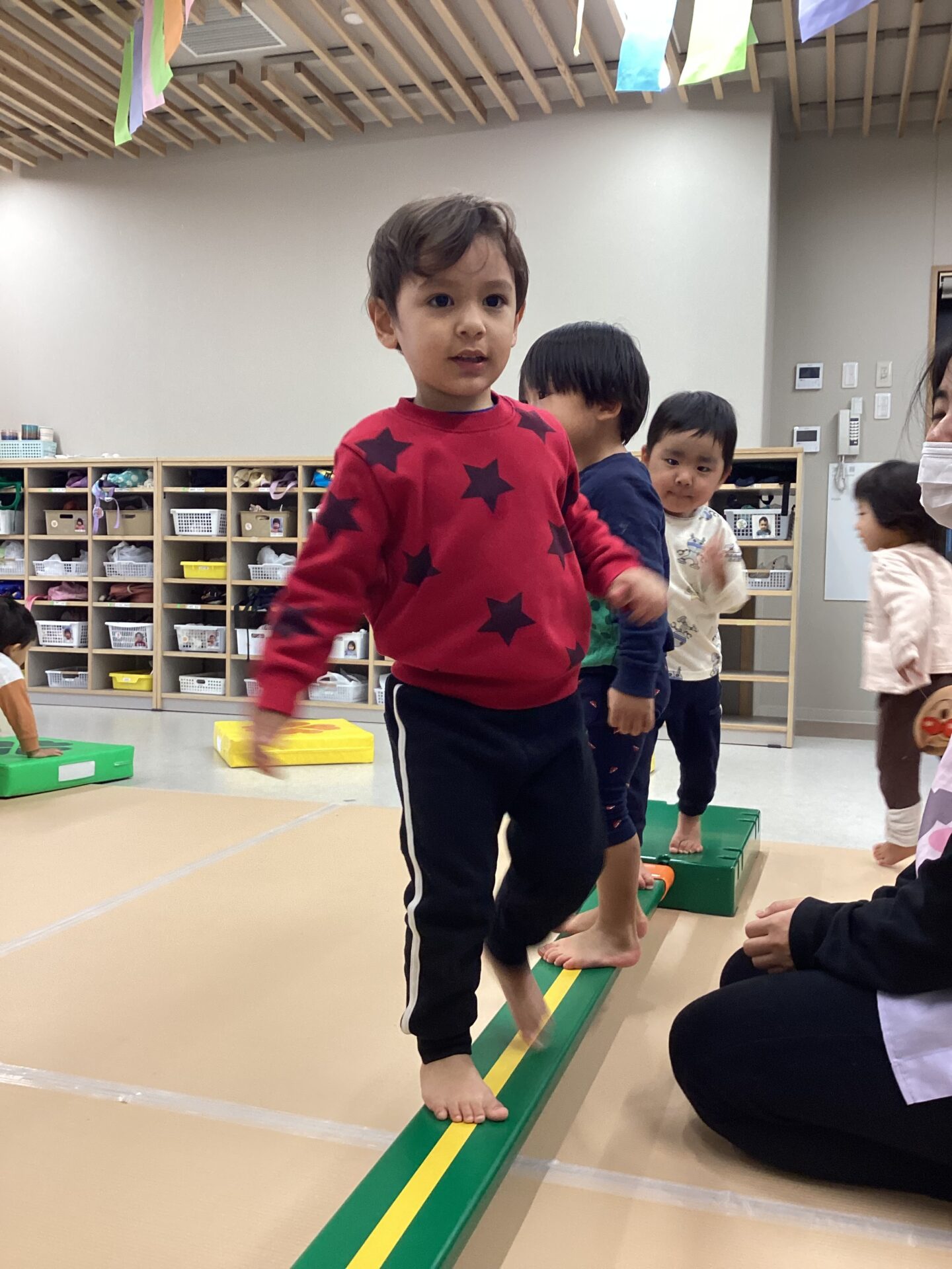 保育者は、巧技台の組み合わせを少しずつ変えて難易度を調整したり、新しい音楽を準備したりしながら、子どもたちが「次はどうしよう?」とワクワク出来る環境を整えています。
