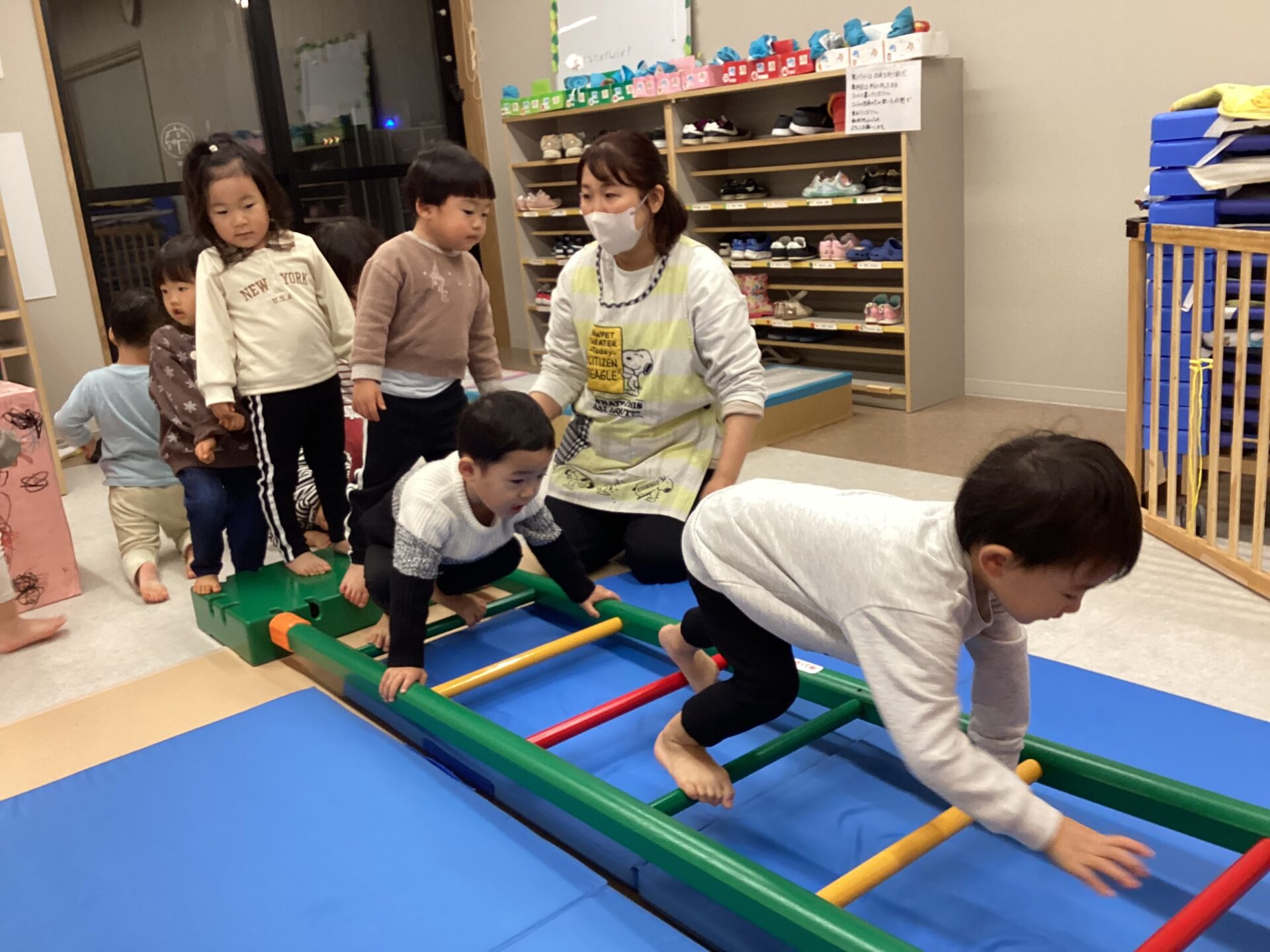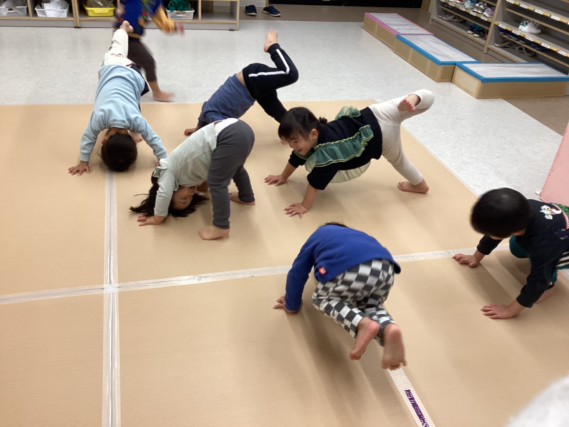 天候に応じて、室内では「サーキット遊び」や「体操」を楽しんでいます。