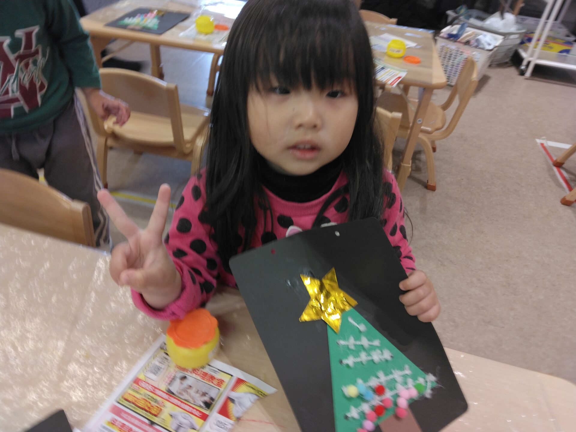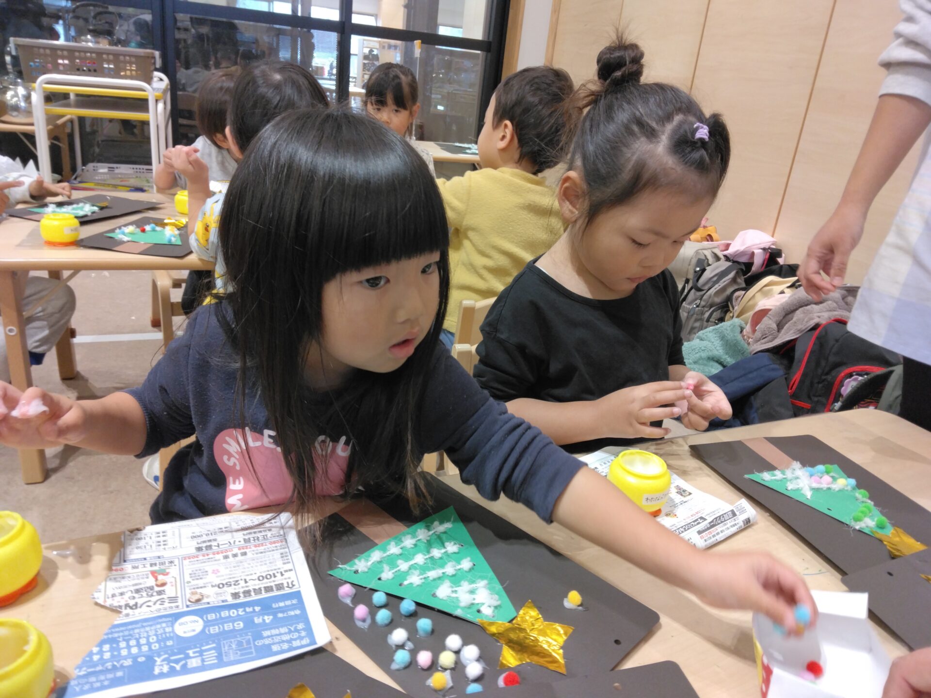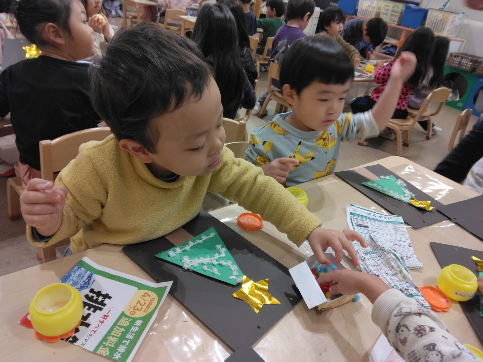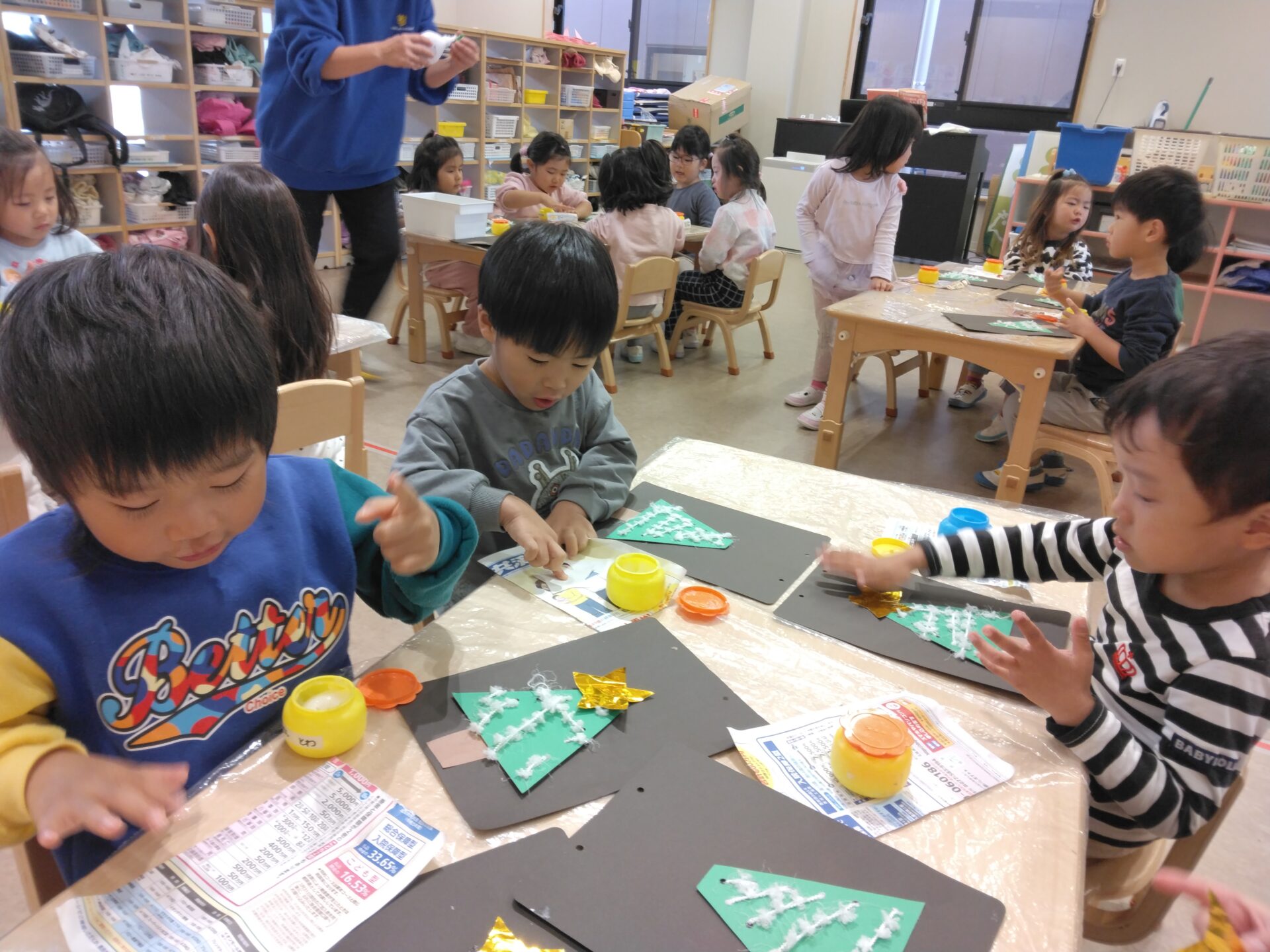 その中で、子どもたちが好きなキラキラやツリーを使ったクリスマスの制作をしました。