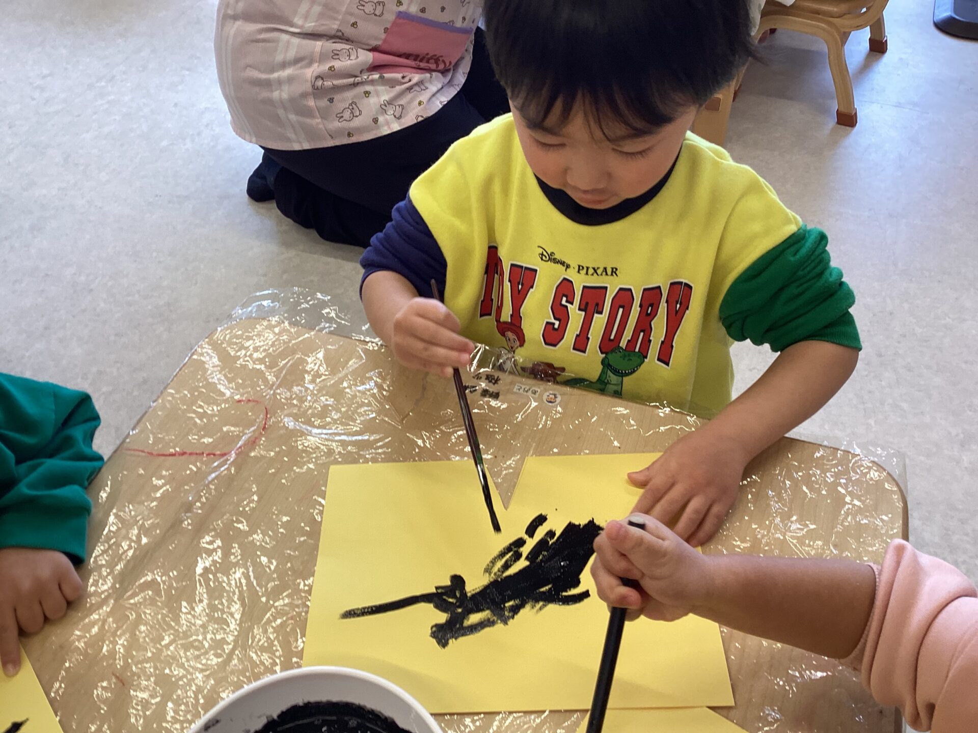 細い筆を使って、黄色い画用紙に線を描きました。